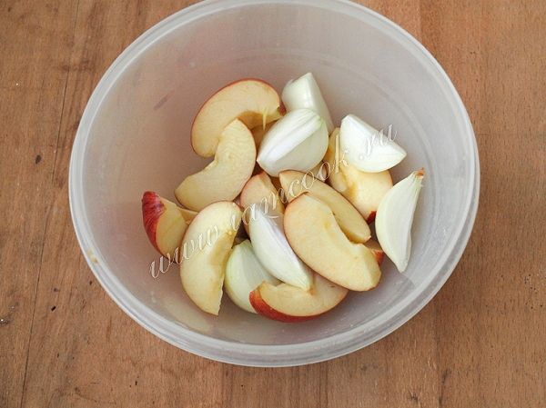 Подготовить яблоки и лук. Нарезать их нужно крупными дольками.Яблоки можно брать любые, считается что лучше с кислинкой, но у меня в этот раз были сладкие и тоже получилось очень вкусно. Чистить яблоки не нужно.