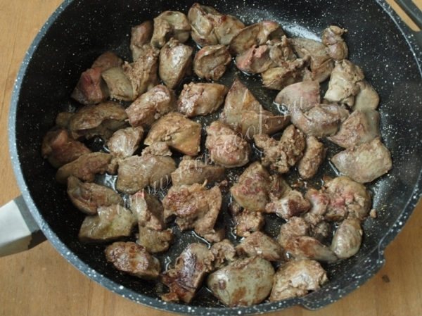 Затем добавить лук. Посолить и поперчить печень. Жарить до готовности лука минут 5-6.