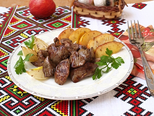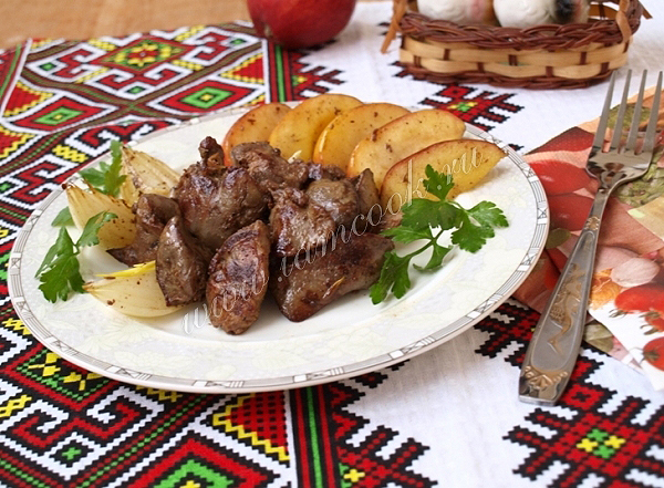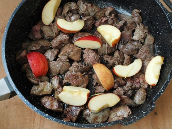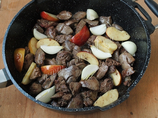 Еще несколько фотографий куриной печени жареной с яблоками и луком.