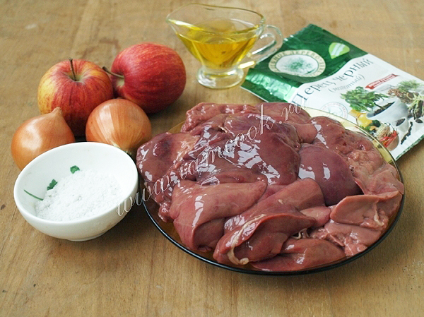 Для приготовления этого простого блюда нам понадобится куриная печень, лук, яблоки, чёрный перец, соль и растительное масло.