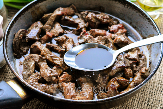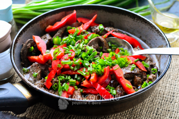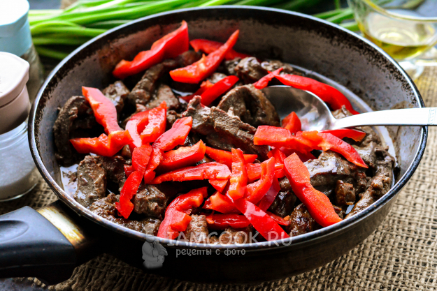 Всыпьте сладкий перец в сковороду и обжаривайте с печенью и соусом еще 5-6 минут. Соевый соус пропитает печень, а сладкий перец придаст блюду приятный аромат.