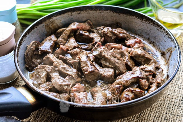 Разогрейте масло на сковороде, выложите кусочки печени и обжаривайте 8-10 минут, помешивая.