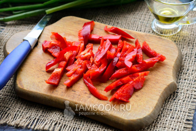 Очистите сладкий перец от семян, нарежьте овощ полосками.