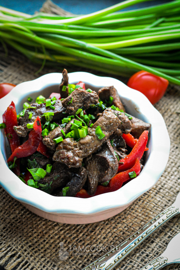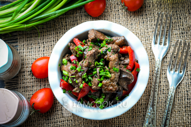 Мелко нарежьте зеленый лук и всыпьте в сковороду, перемешайте, жарьте все вместе еще 1-2 минуты, попробуйте на вкус, поперчите и посолите по вкусу. Поджарка из говяжьей печени готова.
