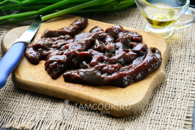 Говяжью печень промойте, срежьте пленку, нарежьте длинными полосками.