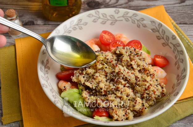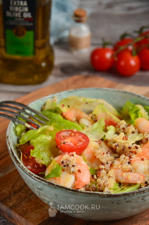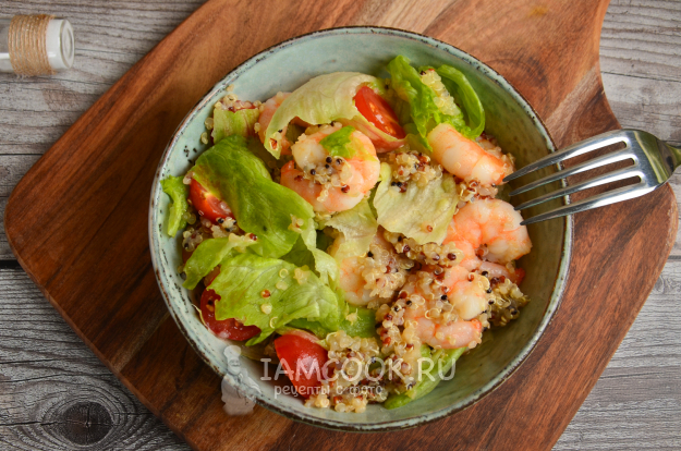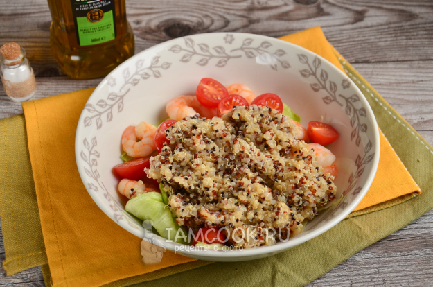 Салат с киноа и креветками готов. Можно охладить его в холодильнике, после чего подать.