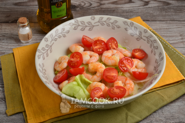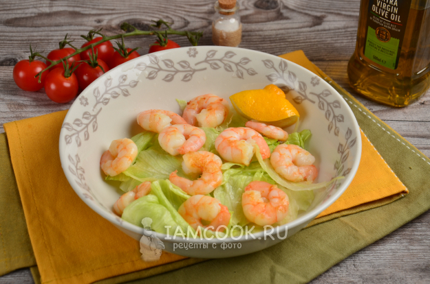 Отправьте в салатник обжаренных креветок, сбрызните их соком лимона.