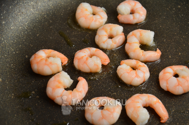 На разогретой сковороде раскалите ложку оливкового масла, выложите очищенных креветок и обжаривайте минуту-полторы.