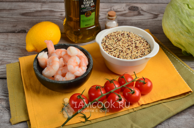 Подготовьте все необходимые продукты для салата с киноа и креветками. Если креветки были заморожены - разморозьте их при комнатной температуре, почистите и помойте. Если креветки сырые, их нужно проварить минуты 3 в кипящей воде.