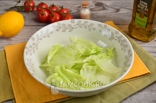 В салатник положите листья салата Айсберг, которые нужно предварительно помыть, обсушить и порвать руками на небольшие кусочки.