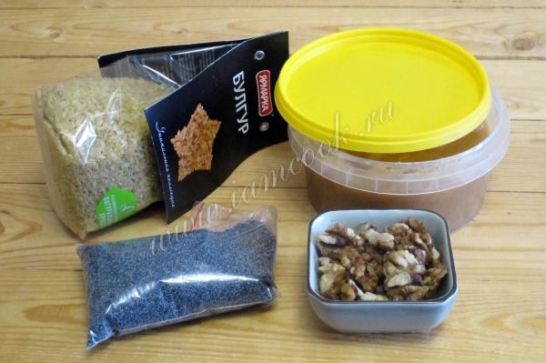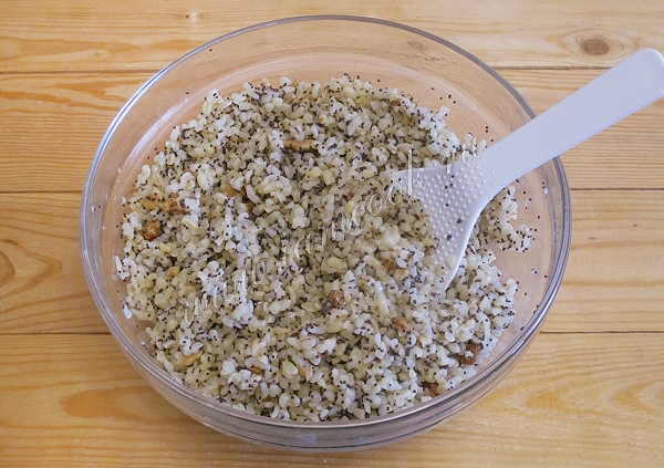 Грецкие орехи подсушите и поломайте на кусочки, а затем орехи и мак соедините с булгуром.