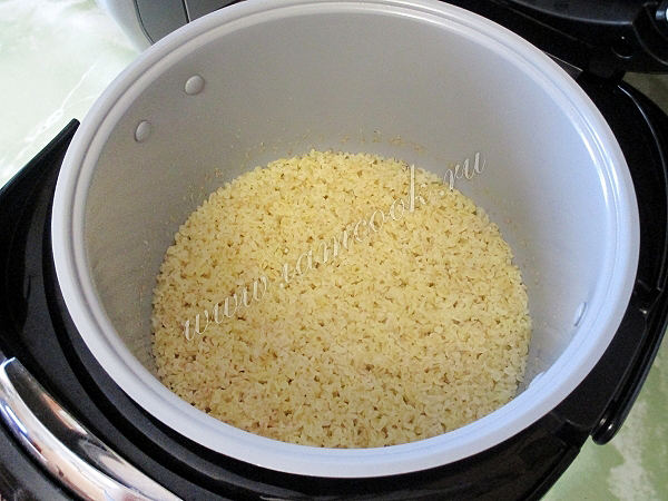 Залейте промытый булгур водой (или компотом) и установите режим, который дает рассыпчатую кашу ("рис", "гречка", иногда ставят "разогрев 15-20 минут" или устанавливают режим "мультиповар").