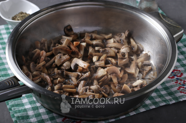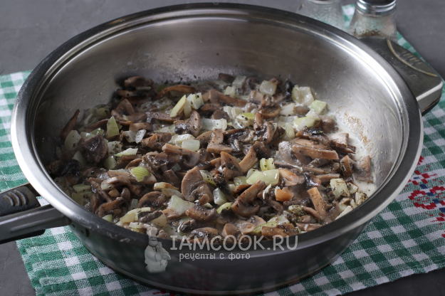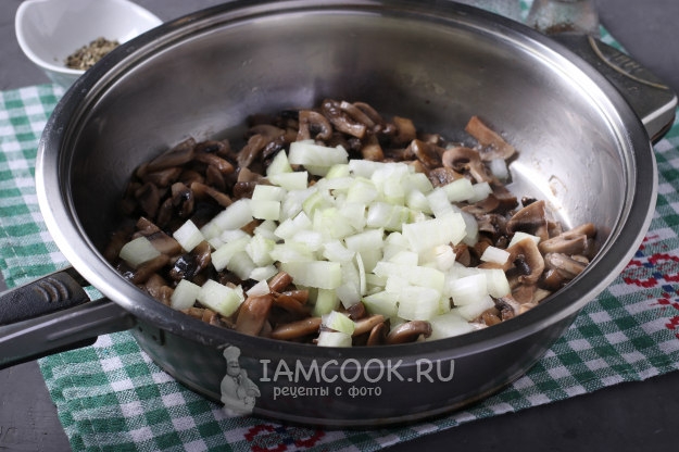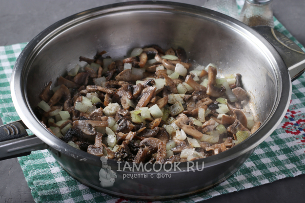 Готовить всё вместе до прозрачности лука, затем посолить и поперчить.