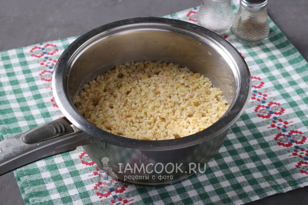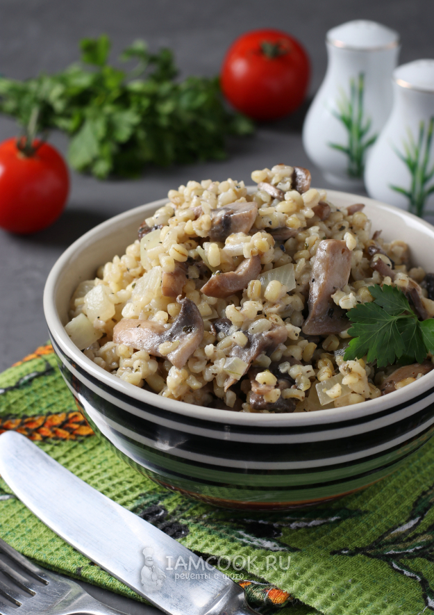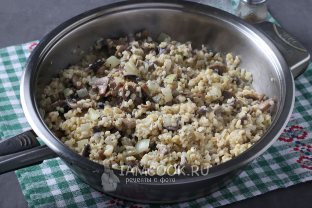 Разогреть в сковороде постное масло, выложить грибы и готовить до выпаривания жидкости. Параллельно в другой кастрюле поставить варить булгур в соотношении 1:2 в подсоленной воде около 15 минут.