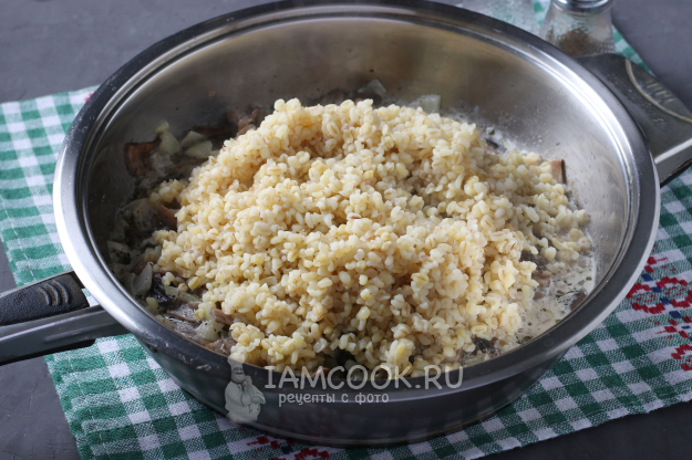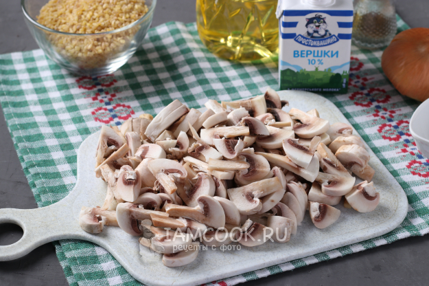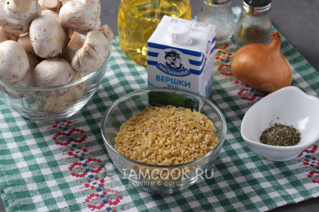Для приготовления булгура с грибами в сливочном соусе подготовить из списка необходимые ингредиенты.