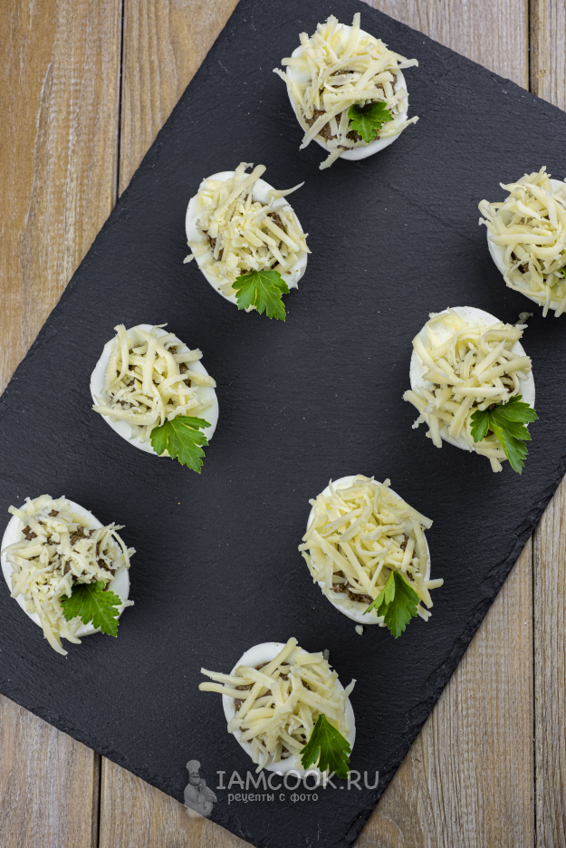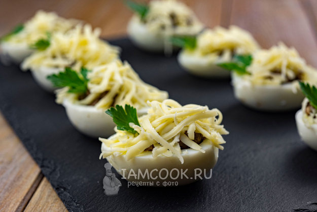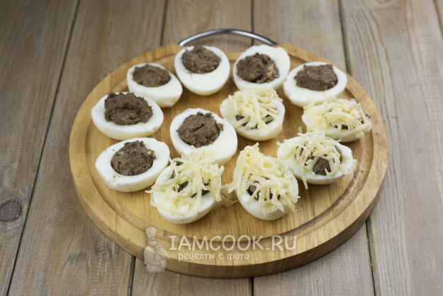 Каждую яичную половинку заполним грибной начинкой, воспользовавшись чайной ложечкой. Сверху присыплем крупно натертым сыром.