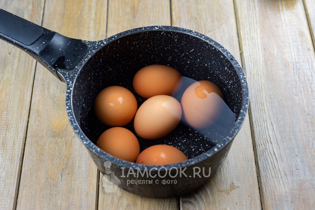 Сварим яйца. Варить их будем 10 минут с момента кипения, затем сольем кипяток и охладим.