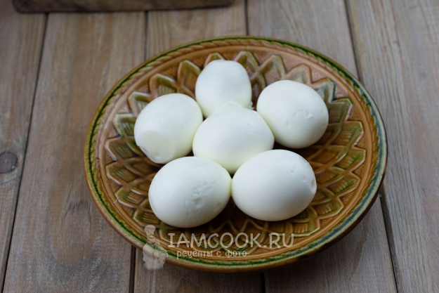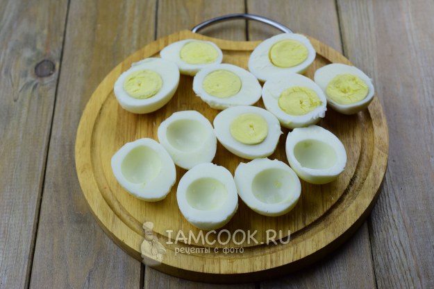 Вареные яйца разрежем на две части каждое, извлечем желтки.