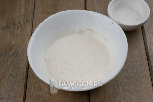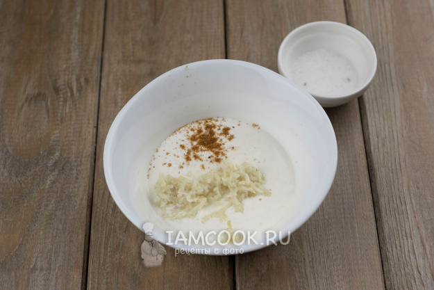 В миску выложим сметану, засыплем соль, добавим специи, выдавим через пресс чеснок.