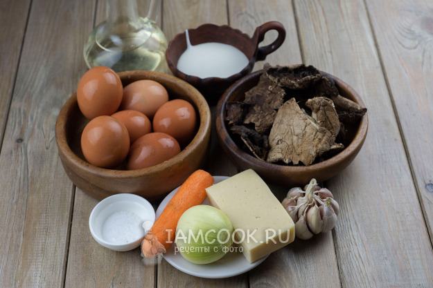 Возьмём ингредиенты для приготовления яиц, фаршированных сухими грибами. Сушеные грибы лучше всего замочить с вечера. Морковь, чеснок и лук удобно почистить сразу.
