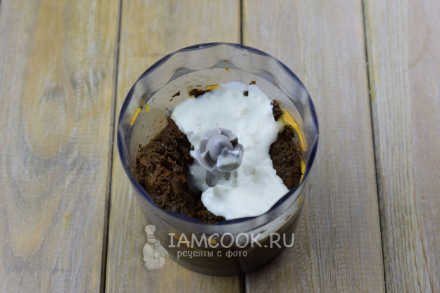 Затем к полученной грибной массе выложим сметанный соус. Вновь блендер запустим на 30 секунд.