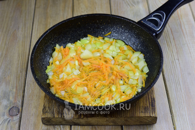 В сковороде разогреем растительное масло и выложим измельченные овощи, обжарим их до мягкости на среднем огне, постоянно помешивая лопаткой.