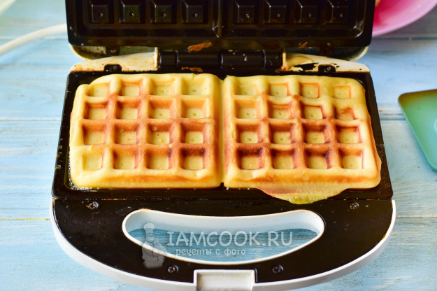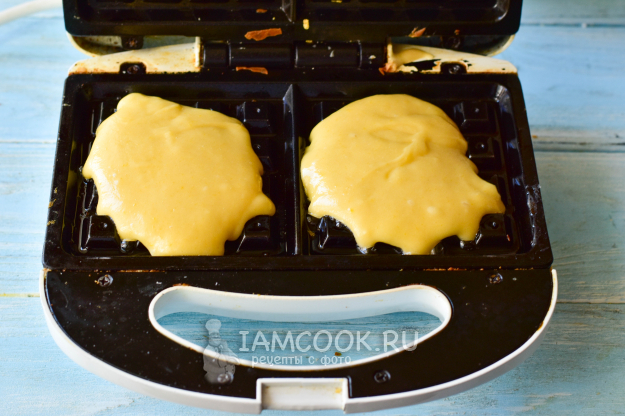 Разогрейте электрическую вафельницу. Ложкой выложите на две половины тесто.