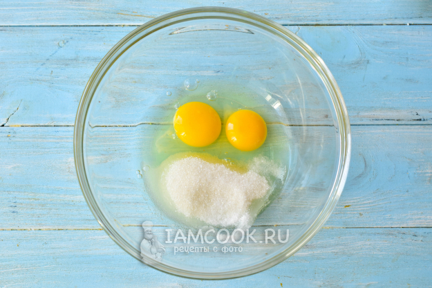 В миску вбейте куриные яйца, добавьте соль и сахар.