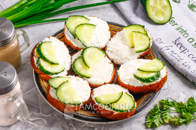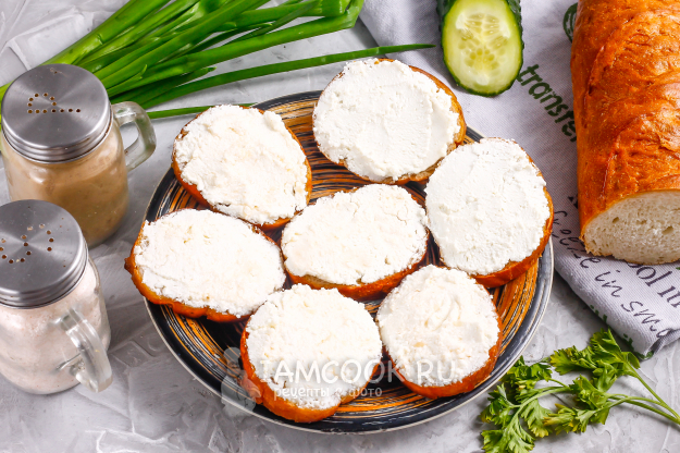 Остудите хлебные гренки и смажьте их творожным сыром. Если сыр плотный, то можете смешать его с майонезным соусом или сметаной.