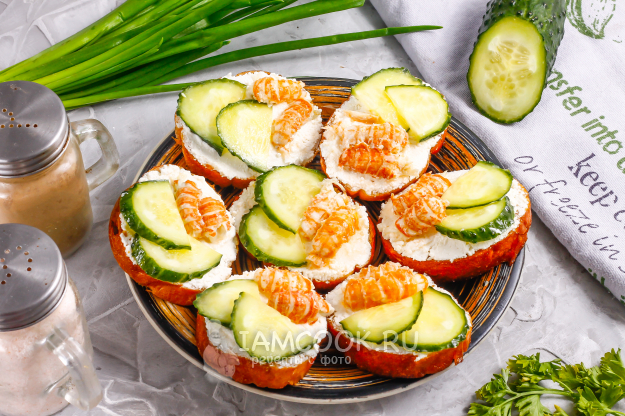 Итак, подготовьте необходимые ингредиенты для канапе с креветками и огурцом.