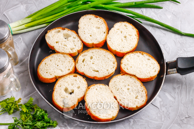 Багет разрежьте пополам и одну его половину нарежьте ломтиками толщиной не более 1 см. Обжарьте их с обеих сторон по 1 минуте на сковороде, предварительно раскалив на ней растительное масло без запаха. Нагрев должен быть умеренным, так как хлебная основа очень быстро может подгореть.