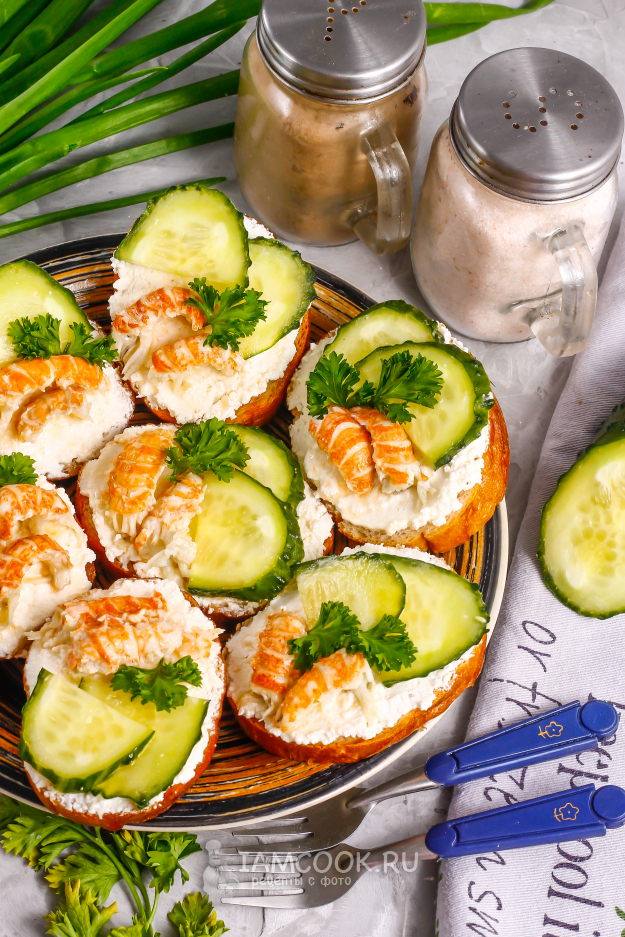 Украсьте приготовленное блюдо свежей петрушкой или укропом, зеленым луком. Подайте канапе с креветками и огурцом к столу, пока хлеб не стал влажным. Можно заранее обжарить гренки и создавать канапе непосредственно перед подачей.