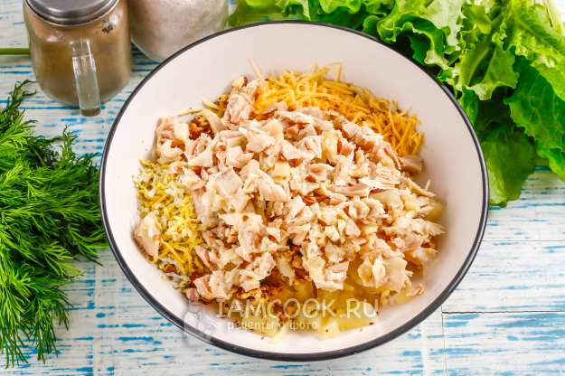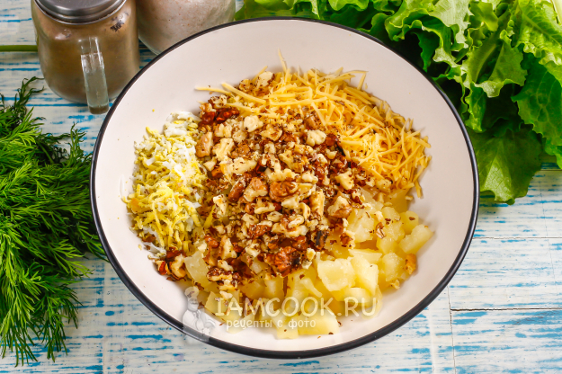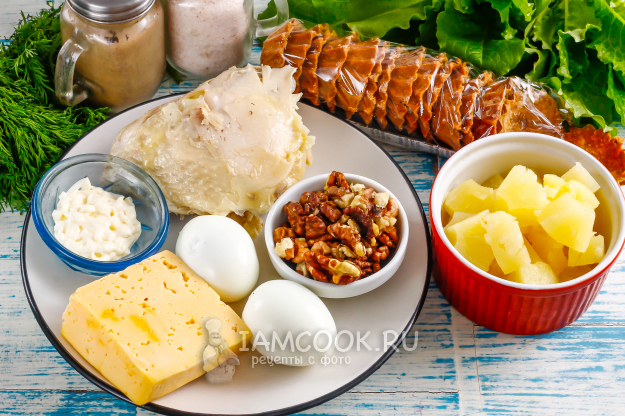 Подготовьте необходимые ингредиенты для тарталеток с курицей, ананасом и грецким орехом.