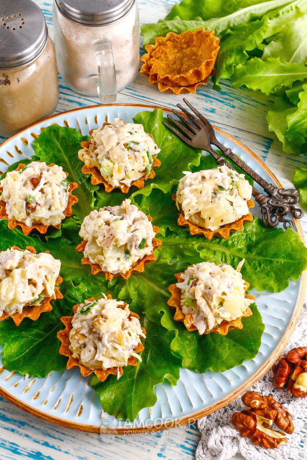 Наполните тарталетки приготовленной начинкой прямо перед подачей на стол, чтобы они не размокли. Начинку вы можете создать заранее и хранить в холодильнике. Выложите тарталетки с курицей, ананасом и грецким орехом на листья салата, шпината и подайте.