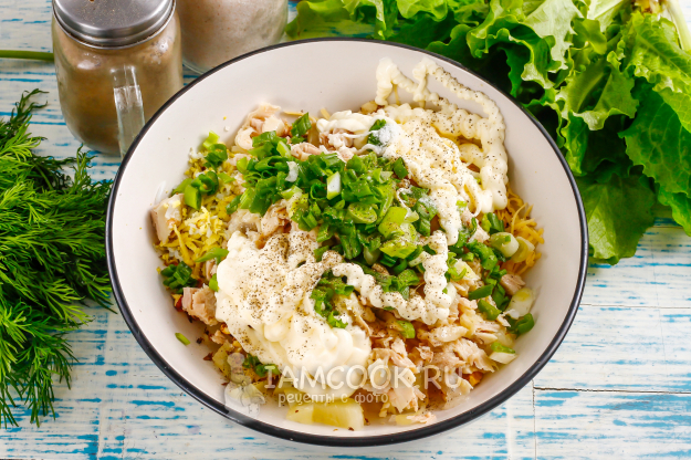 Промойте зеленый лук, мелко нарежьте и добавьте в емкость вместе с майонезом любой жирности, солью и молотым черным перцем. Аккуратно все перемешайте.