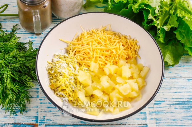 Очистите отварные куриные яйца от скорлупы, обязательно промойте их в воде, исключая даже мелкие части скорлупы, натрите в глубокую емкость на терке с мелкими ячейками. Так же натрите и твердый сыр. Извлеките из сиропа консервированные ананасы и дайте стечь с них жидкости. Затем нарежьте ананасы мелкими кубиками.
