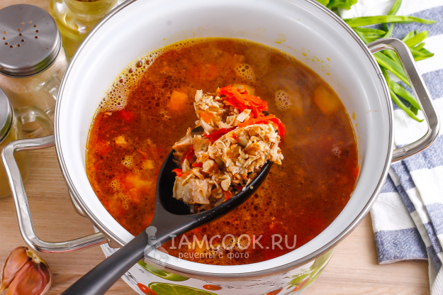 Разлейте горячий борщ с квашеной капустой и тушенкой в глубокие тарелки и подайте к столу вместе со сметаной, майонезом - по вкусу.