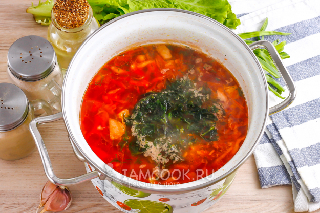 Измельчите свежую зелень и добавьте в кастрюлю вместе с солью. Перемешайте и отварите еще 2-3 минуты. Попробуйте на вкус, подкорректируйте при необходимости.