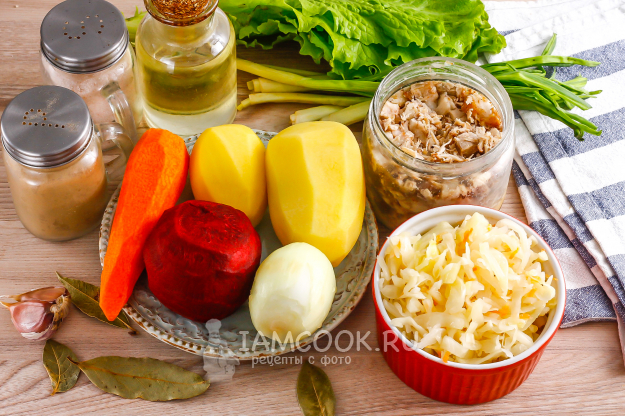 Подготовьте необходимые ингредиенты для борща с квашеной капустой и тушенкой.