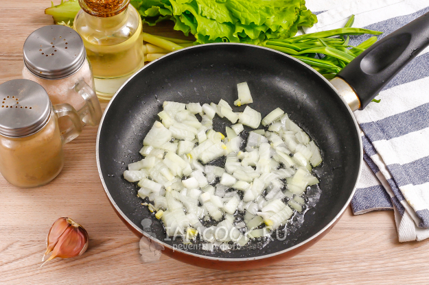 Промытый лук нарежьте мелкими кубиками и обжарьте в растительном масле на сковороде.