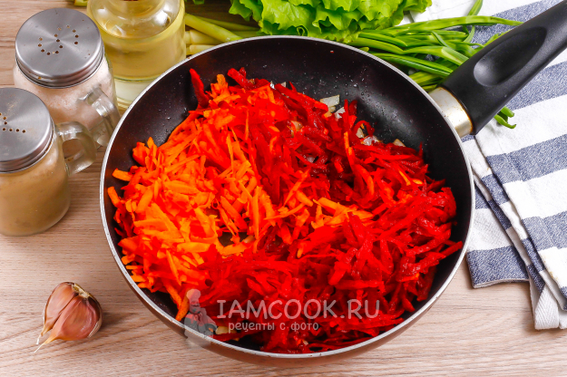 Добавьте морковную и свекольную массы. Обжарьте примерно 3-5 минут - до мягкости. На этом этапе вы можете добавить и томатную пасту либо помидоры, но я не люблю их привкус в борще. Помните, что при добавлении томатов вам нужно будет всыпать немного сахара - он удалит кислинку помидорного вкуса.