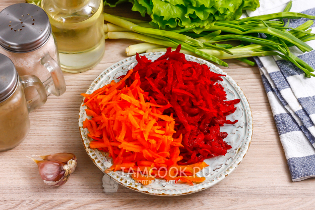 Натрите морковь и свеклу на терке с крупными ячейками. Часть свекольной массы отложите - ее добавите за 5 минут до окончания варки вместе с квашеной капустой. Такой прием позволит придать борщу красочный бордовый цвет, когда бульон сменит свой цвет. Иногда бывает, что при долгой варке цвет блюда как бы "выгорает" и борщ получается коричневым или бледно-красным. Вот тогда ситуацию и спасает часть натертой свекольной массы!