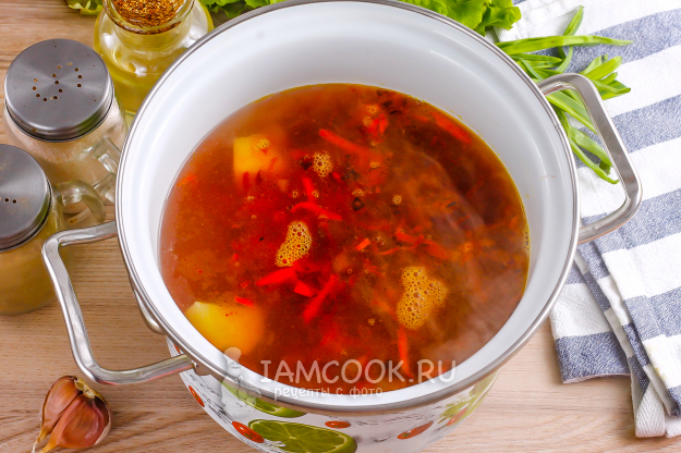 Отожмите ее от жидкости и выложите в борщ. Аккуратно перемешайте. Затем добавьте оставшуюся свекольную массу.