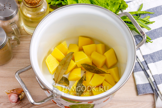 Картофель очистите от кожуры вместе с остальными овощами и промойте в воде. Нарежьте картофель средними кубиками и выложите нарезку в кастрюлю или казан, добавьте лавровые листья, влейте горячую воду и поместите емкость на плиту. Как только жидкость закипит - удалите образовавшуюся пену и варите картофель 15 минут.