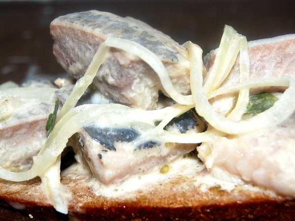 Сверху разложить кусочки сельди, посыпать измельчённым луком.