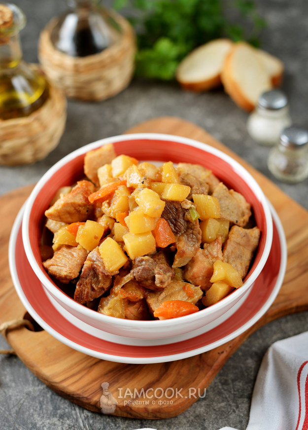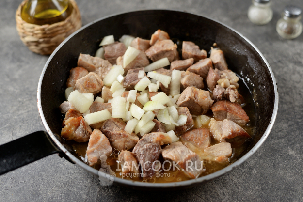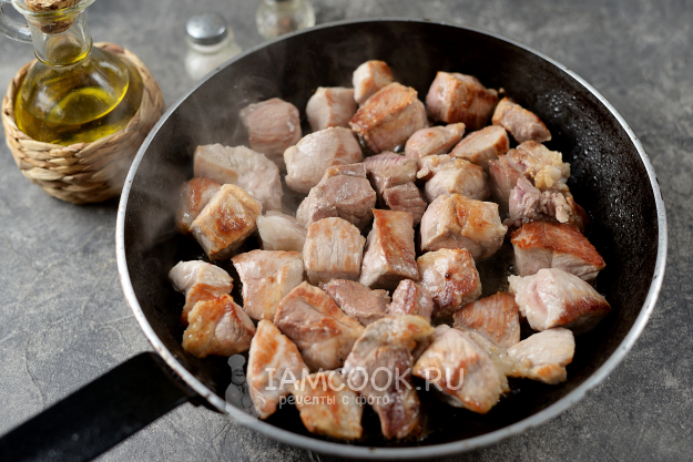 Нарежьте свинину небольшими кусочками обжарьте ее на сильном огне в небольшом количестве постного масла до румяной корочки со всех сторон. Дальше сделайте огонь минимальным, накройте крышкой, чтобы из мяса выделился сок, и тушите на самом тихом огне минут 30. Если жидкость будет выкипать, тогда подливайте понемногу из чайника, чтобы не пригорало.