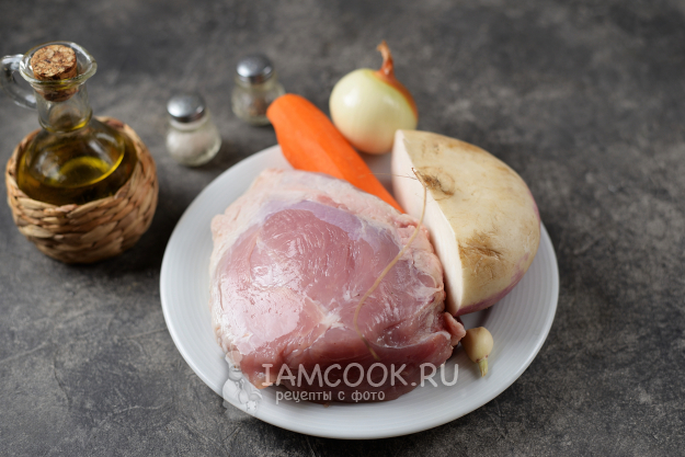 Возьмите все продукты для приготовления жареной репы с мясом (свининой). Свинину лучше брать лопатку, она чуть быстрее готовится, чем задняя часть. Лук, морковь, чеснок и репу очистите от кожуры-шелухи, все помойте и обсушите.