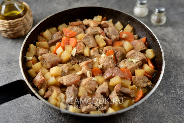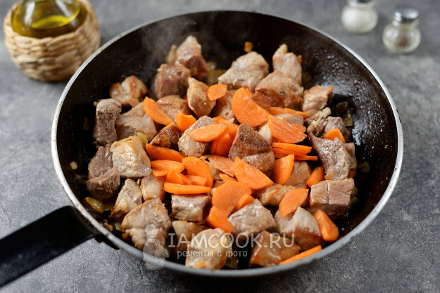 Морковь нарежьте тонкими ломтиками или натрите на крупной терке, положите к мясу, готовьте минут 5.