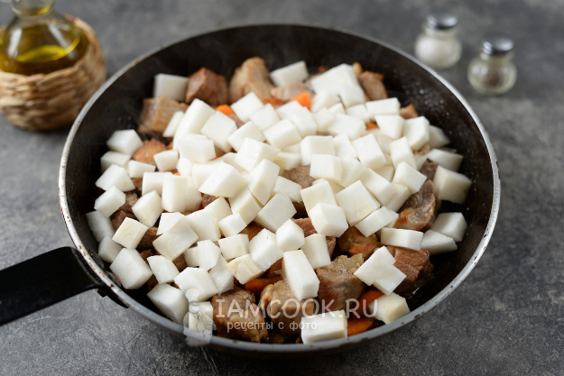 Очищенную от кожуры репу нарежьте мелким кубиком, переложите в сковороду, подлейте еще немного воды и готовьте, часто помешивая, минут 5-7. От количества добавленной воды будет зависеть количество подливы в готовом блюде, ею потом можно будет полить гарнир.