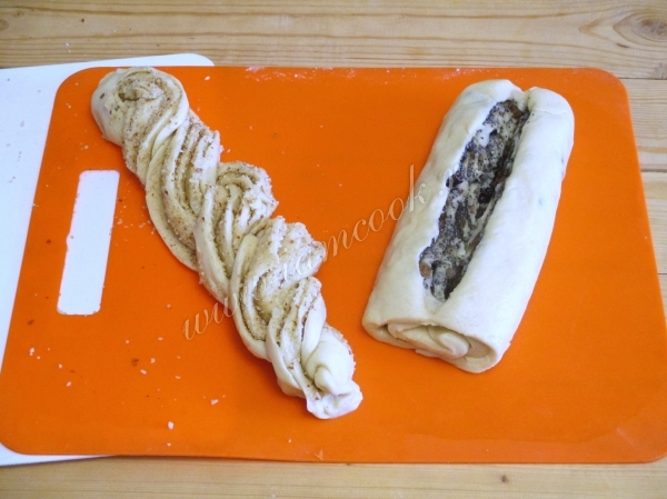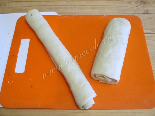 Разрежьте тонкую заготовку на две части и скрутите их между собой в плетенку. Короткий рулет разрежьте вдоль, но не прорезая нижний слой теста.